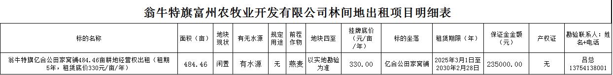 484.46畝土地經(jīng)營(yíng)權(quán)出租,位于翁牛特旗億合公鎮(zhèn)田家窩鋪村,租賃期限自2025年3月1日起至2030年2月28日