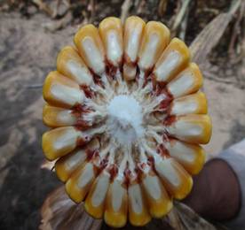 春播區(qū)從出苗至成熟126天左右。株型緊湊,株高271-286cm,穗位96cm。穗行數(shù)16-18 行,紅軸,果穗整齊、均勻;出籽率高達(dá)90%,軸細(xì)、粒深;長(zhǎng)勢(shì)整齊一致,不空桿,產(chǎn) 量年度間差異小,穩(wěn)產(chǎn)性好。
