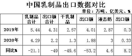 液態(tài)奶:2020年我國共出口液態(tài)奶3.0萬噸,同比增加4.6%,出口額0.33億美元,同比增長8.2%。
