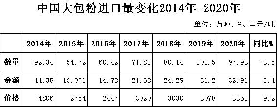 據(jù)中國海關(guān)統(tǒng)計(jì),2020年進(jìn)口大包粉97.93萬噸,同比-3.5%,進(jìn)口額32.91億美元,同比+5.4%,均價(jià)3361美元/噸,同比+9.2%,主要來自新西蘭占71%、歐盟占12.7%、澳大利亞占7.9%。