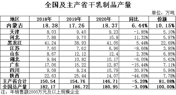 奶粉:根據(jù)國家統(tǒng)計(jì)局?jǐn)?shù)據(jù),2020年全國奶粉產(chǎn)量101.23萬噸,同比下降9.43%,其中黑龍江產(chǎn)量40.01萬噸,同比增長3.02%,占總產(chǎn)量的39.52%,位居全國第一位;內(nèi)蒙古產(chǎn)量9.58萬噸,同比增長14.90%,占總產(chǎn)量的9.46%,位居全國第四位。